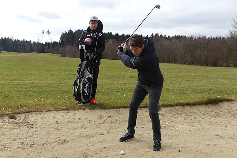 Pascal Meier schlägt ab, Caddie Borth schaut gebannt zu. (Bild: indoorsports.ch)