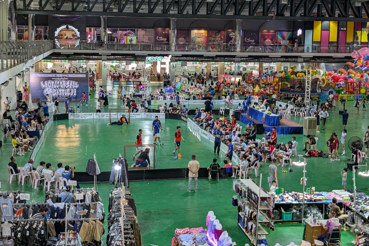 In Laos wird in Einkaufszentren farbenfroh Werbung für Unihockey gemacht.