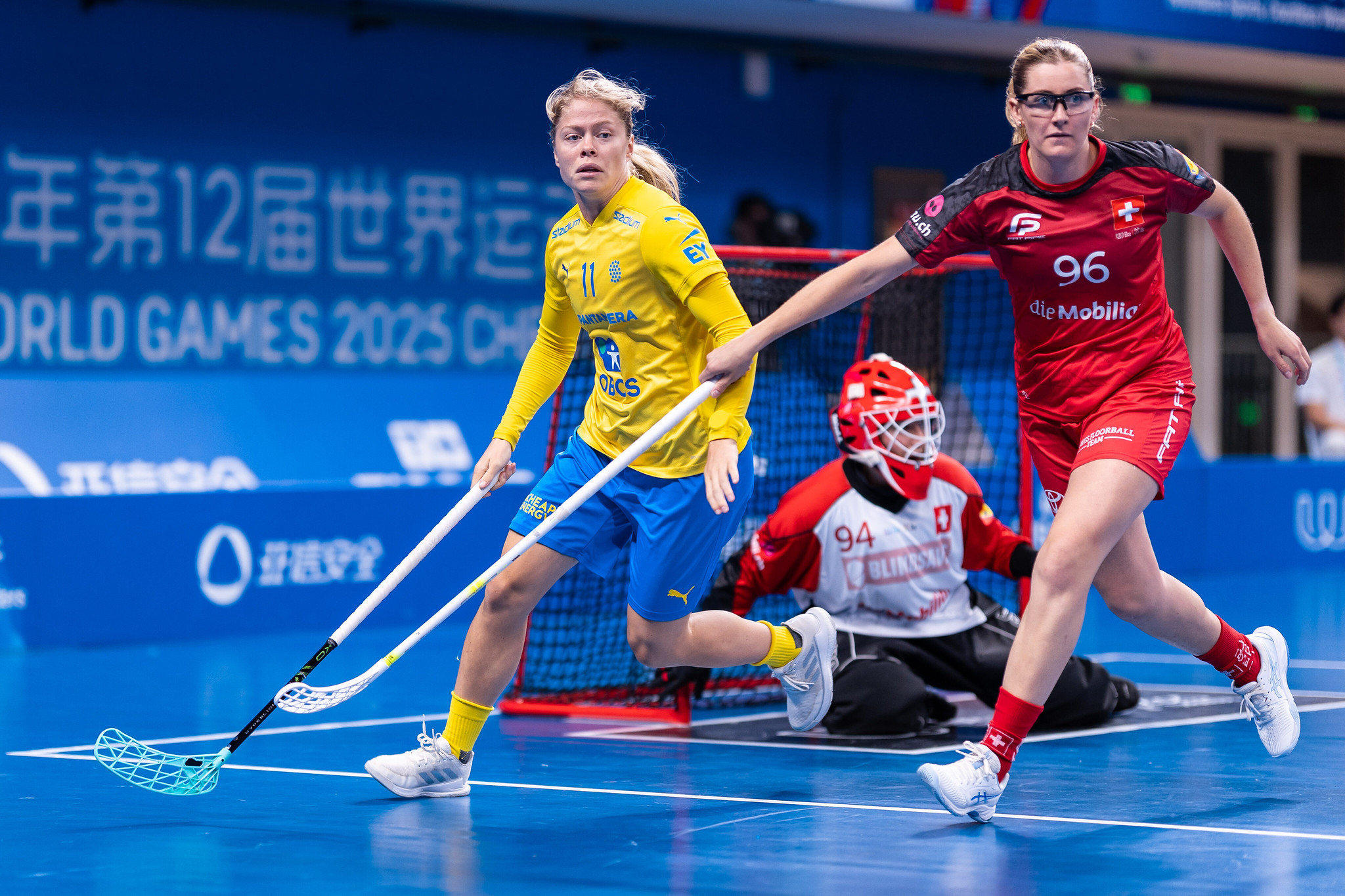 Für die Schweizerinnen stand heute das dritte und letzte Gruppenspiel der World Games auf dem Programm. Nach zwei Spielen in der Favoritenrolle trafen sie heute auf die amtierenden Weltmeisterinnen aus Schweden. Diese bewiesen gleich von Beginn an, dass sie dieser Rolle gerecht werden wollten und liessen die Schweizerinnen nicht an den Ball. Es dauerte daher auch nur 61 Sekunden, bis Lara Heini zum ersten Mal hinter sich greifen musste. Der Treffer war allerdings sehenswert: Mira Markström spickte den Ball ohne hinter sich zu schauen zwischen den eigenen Beinen hindurch ins Tor. Die Schwedinnen blieben mehrheitlich in Ballbesitz. «Wir hatten anfangs Mühe, uns an das Tempo von Schweden anzugleichen», erklärt Isabelle Gerig nach dem Spiel. «Es dauerte ein paar Minuten, bis wir auf dem gleichen Niveau waren.» In der 4. Minute eroberten die Schweizerinnen zunächst den Ball und Céline Stettler wollte den Angriff lancieren. Der Ball landete jedoch auf der Schaufel von Hanna Nordstrand, welche kurzen Prozess machte und direkt abschloss zum 2:0. Kurz darauf gelang den Schweizerinnen ein Rush vors schwedische Tor. Doris Berger zog ab und der Ball prallte - aus Schweizer Sicht - glücklich am Schuh einer Schwedin ab ins Tor. Nur etwas mehr als eine Minute später lancierte Marcia Wick aus der eigenen Zone Seraina Fitzi, die unbehelligt loslief und den Ball mit viel Kraft ins gegnerische Netz zimmerte. Der Spielstand war nun 2:2 ausgeglichen.